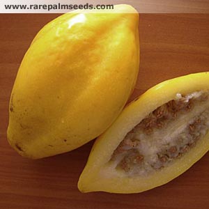 میوه ها حدود 6 تا 15 سانتیمتر طول و 3 تا 8 سانتیمتر نیز پهنا دارند. هر میوه دارای پنج شیار طولی است که از ابتدا تا انتهای آن را در بر می گیرد. میوه های نارس به رنگ سبز و میوه های رسیده به رنگ زرد تا نارنجی دیده می شوند. پالپ این میوه ها خوراکی بوده و مزه ای مشابه مزه ی خربزه درختی معمولی دارد و به صورت پخته شده یا خام به مصرف خوراکی می رسد. هر درخت ممکن است بیش از 50 تا 60 عدد میوه در هر فصل تولید کند.