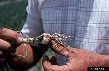 پیاز آلوده زودتر بالغ شده و به راحتی از جای کنده می شوند ، گیاه آلوده مرتب ریشه زایی می نماید و متعاقباً آلوده می گردد و گیاه حالت کمبود از خود نشان می دهد .