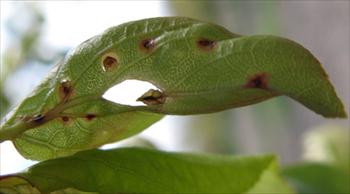در هلو لکه ها معمولاً در حاشیه برگها در طرفین و رگبرگ اصلی ظاهر می شود و یکنواختی سوراخ های ایجاد شده از نظر اندازه و شکل بیشتر از زرد آلو است.
