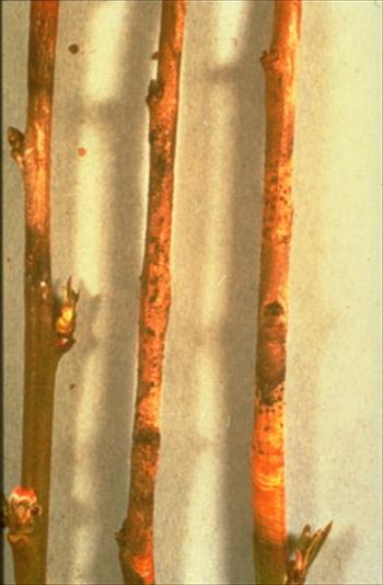 قارچ شاخه های جوان یكساله را آلوده می كند .آلودگی اغلب از طریق زخم ها در محل