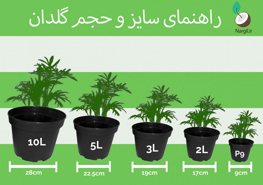 در ایران معمولا سایز بندی گلدان ها بر اساس اندازه قطر دهانه آنها میباشد ولی در برخی کشور های دیگر این سایز بندی براساس حجم گلدان به لیتر یا گالن میباشد