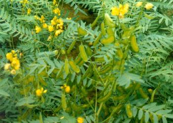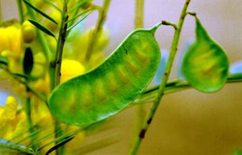 آن زرد مایل به كبود،میوه آن به صورت غلاف قوسی و خمیده از نظر اندازه در حدود طول