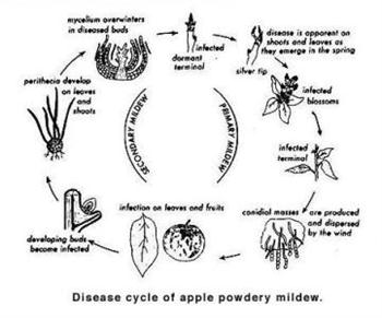 اگر آسكوكارپ تشكیل گردد می تواند موجب بقاء قارچ گردد ولی بنظر نمی رسد كلیستوتسیوم در چرخه زندگی قارچ نقش داشته باشد و آسكوسپورهای P.leucotricha موجب آلودگی نمی شوند در بهار به مجرد مناسب شدن شرایط محیطی ریسه ها، داخل جوانه ها فعال شده و تولید كنیدیوم می كند كنیدی ها با باد پخش شده و موجب آلودگی اولیه می شوند سپس از زخمها و لكه های جدید نیز كنیدیوفورها تولید كنیدیهای جدید را كرده و موجب انتشار بیماری و آلودگی های ثانویه می گردند.
