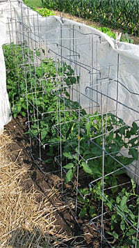 بوتههای گوجهفرنگی در لایهای از پارچه محافظ همهمنظوره باغ پیچیده شدهاند تا از باد و تبخیر بیش از حد محافظت شوند.