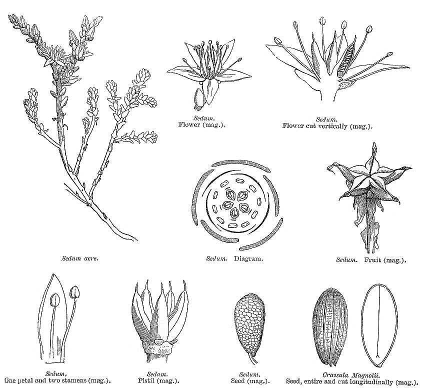 Pseudosedum, Rhodiola,  Rochea,  Rosularia,  Sedum,  Sempervivum,