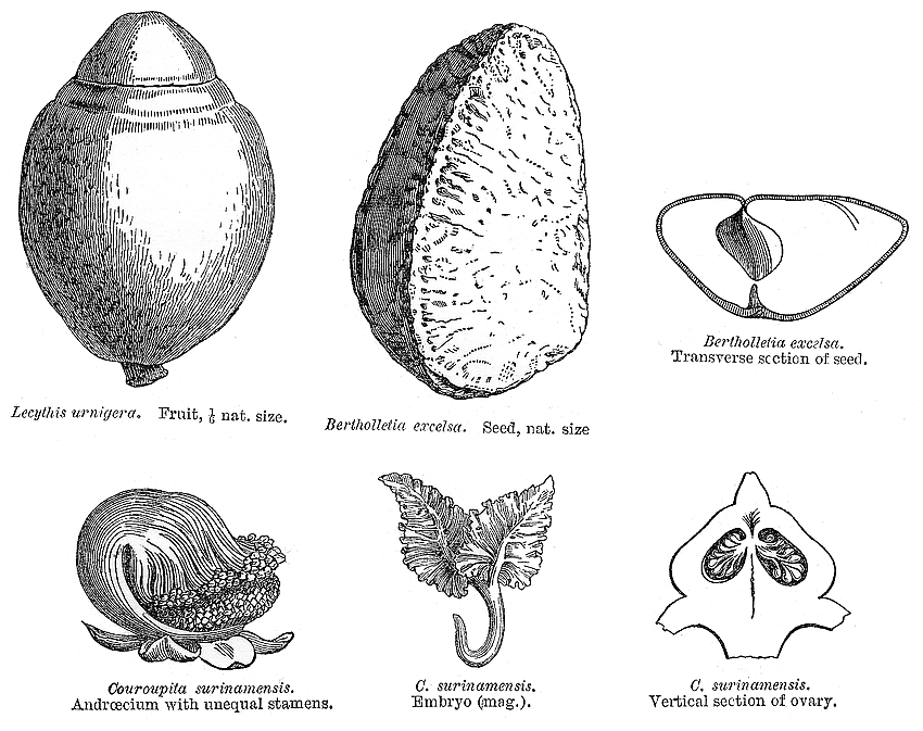 , Bertholletia, Cariniana, Corythophora, Couratari, Couroupita, Eschweilera, Grias, Gustavia, Lecythis.