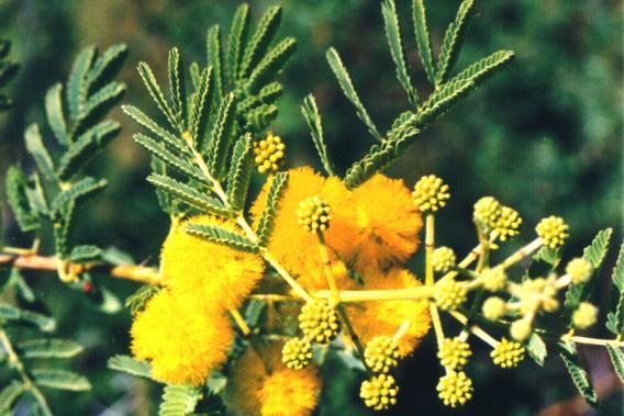 گل ها به رنگ زرد روشن و کروی شکل هستند. این گل ها دارای عطری شیرین بوده که نزدیک فصول بارانی ظاهر می شوند. این گیاهان پرگل بوده و تعداد زیادی گل در فصول مختلف تولید می کنند. حدود 0.1 درصد از گل ها تبدیل به غلاف میوه می شوند.