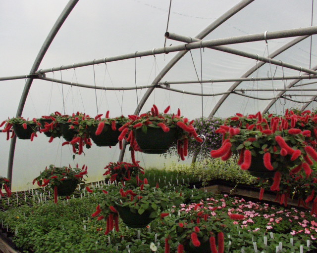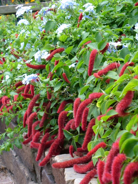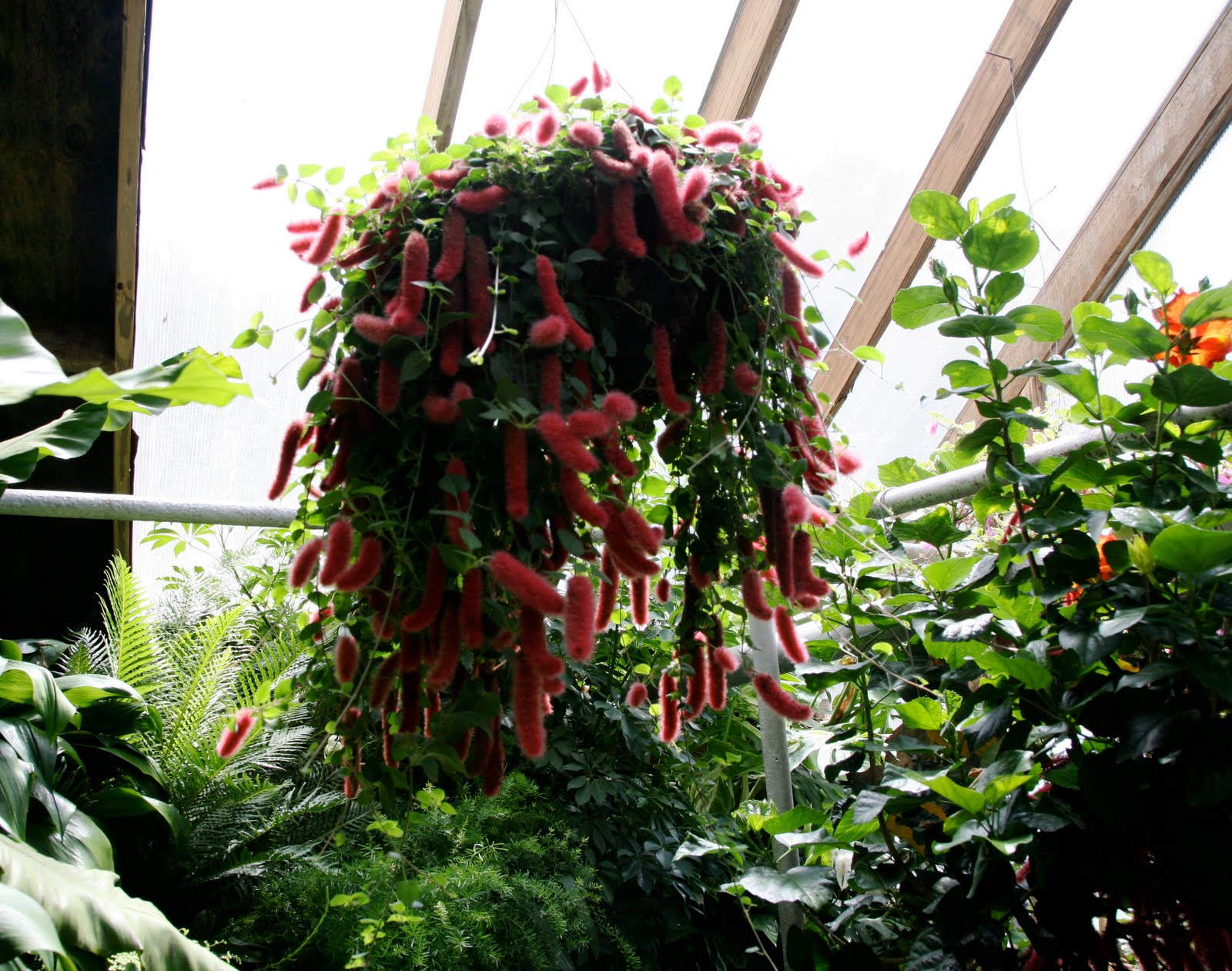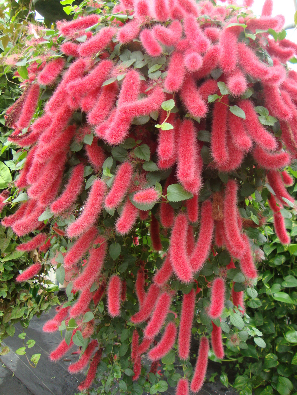 گل های این گیاه زیبا و به صورت شاتون هایی به رنگ قرمز و آویزان می باشند. هر گیاه می تواند تعداد زیادی گل تولید کند. در صورت مناسب بودن و گرم بودن دمای هوا، می تواند در تمام طول سال گلدهی داشته باشد. آن چه که ما در این گیاه، گل می نامیم در واقع سنبله ای است که از تعداد بیشمار گل های ریز به رنگ قرمز روشن تا صورتی تیره تشکیل شده است و حدود 15 تا 40 سانتیمتر نیز طول دارد. تعداد زیادی از این سنبله ها از ساقه های گیاه روییده و آویزان می شود و شکلی شبیه دم گربه پیدا می کند.