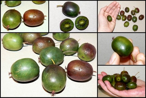 این گیاه میوه های کوچکی همانند میوه های کیوی معمولی تولید می کند. این میوه از نوع سته و خوراکی هستند و طعمی مشابه با طعم کیوی های معمولی دارند. اما به به رنگ های سبز، مایل به قهوه ای یا ارغوانی و با پوستی صاف و بدون کرک دیده می شوند. در برخی موراد نیز به رنگ قرمز دیده می شوند. این میوه ها اغلب از کیوی های معمولی شیرین تر است و می توان تمام بخش های آن را به مصرف خوراکی رساند و نیازی به پوست کندن ندارد. دیواره خارجی پوست آن صاف و بدون کرک و چرمی است.