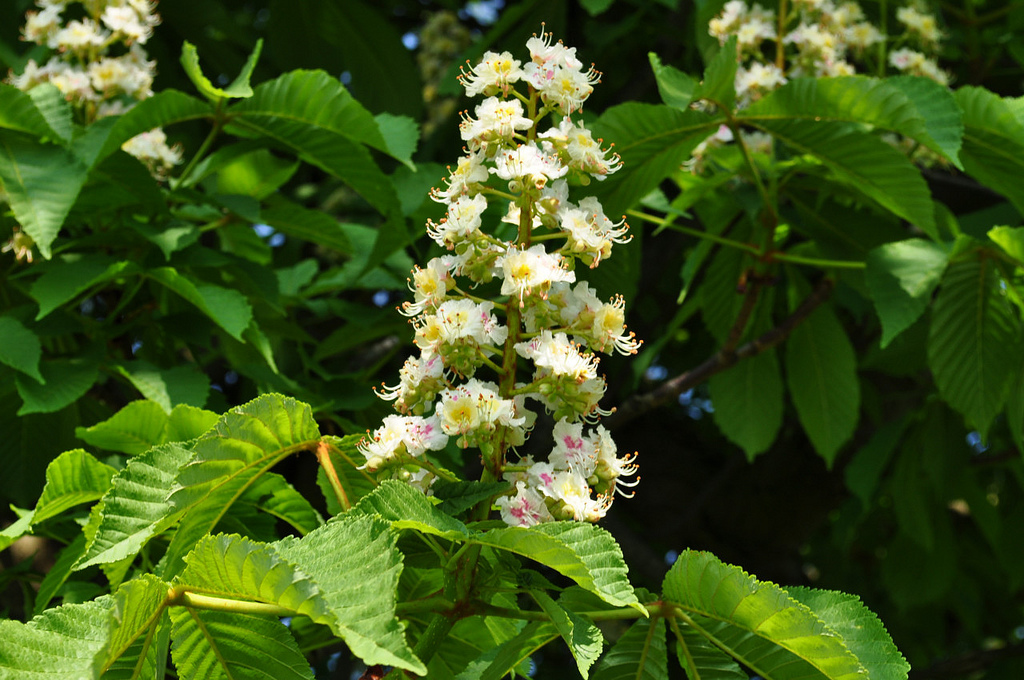 گل هاي این درخت خوشه ای، برافراشته و رو به بالا ،سفیدرنگ با نقطه های زرد یا قرمز است. طول خوشه ها 10-30 سانتی متر است و هر خوشه شامل 20-50 گل است.