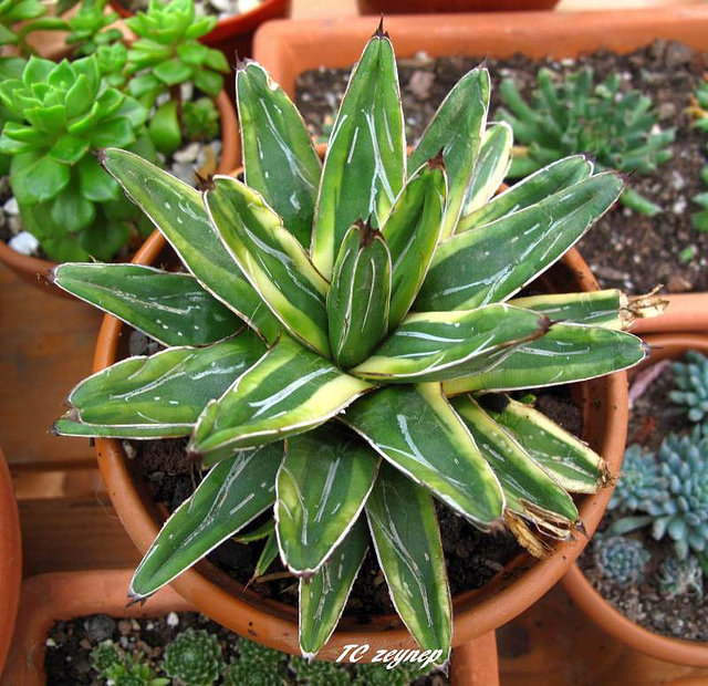 این گیاه رشد خیلی کمی دارد اما محکم و زیباست . فرمهای منحصر به فرد برگ هایش می تواند تا 45 سانتیمتر قطر داشته باشد ،اما به ندرت بیشتر از 22 سانتیمتر رشد می کند ، پهنای برگ ها 3 سانتیمتر است ، معمولا به صورت تکی رشد می کند برگ های آن سفت و ضخیم ، دارای 3 زاویه مثلثی ، سبز تیره با علامتهای سفید تابان در حاشیه برگها ، برگها بدون تیغ هستند تنها یک تیغ کوتاه سیاه و مرکزی دارند.