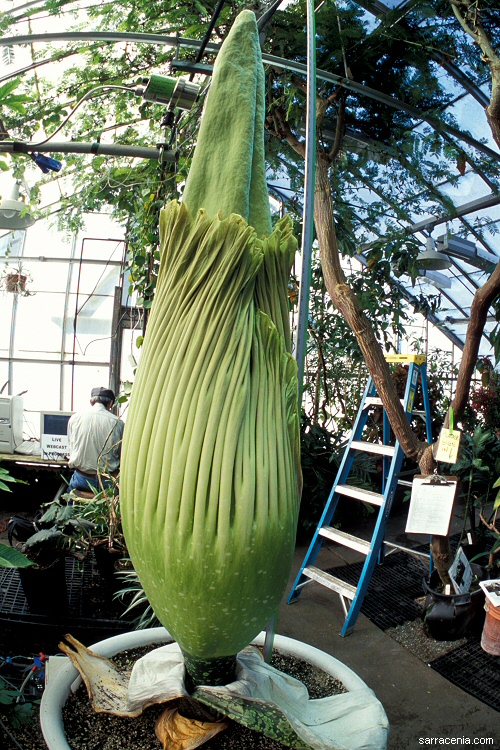 در گیاه تیتان ، اسپادیکس حدود 3 متر رشد می کند و بروی این گل آذین 3 متری هزاران گل قرار می گیرند . معمولاً 3 تا 4 هفته پس از رویش جوانه ، اسپات باز می شود ، اسپات تیتان در خارج سبز رنگ است ولی در قسمت داخلی قرمز تا بنفش تیره است . اسپات چند روز بیشتر باز نمی ماند وپس از آن محور اسپادیکس در مدت 3 تا 5 روز تخریب می گردد .