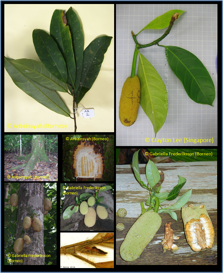 میوه های این درخت استوانه ای شکل تا کروی است و حدود 20 تا 35 سانتیمتر طول و نیز 10 تا 15 سانتیمتر نیز پهنا دارد. پوست میوه نازک، چرمی، به رنگ سبز یا سبز مایل به زرد یا مایل به قهوه ای است. روی پوست برآمدگی های پنج ضلعی بسیاری وجود دارد. گوشت این میوه خوراکی بوده و آریل های آن نیز بذرها را احاطه کرده است. این بذرها نیز پس از بو دادن یا جوشاندن قابل استفاده خوراکی می باشند. گوشت میوه به رنگ سفید مایل به زرد، شیرین، معطر و نرم است. که روی زبان به صورت لغزنده و لزج و کمی فیبری و ترد احساس می شود. مزه ی این میوه ها نیز همانند طعم و مزه ی میوه ی نان و جک فروت و دوریان (قهوه ی سودانی) است.