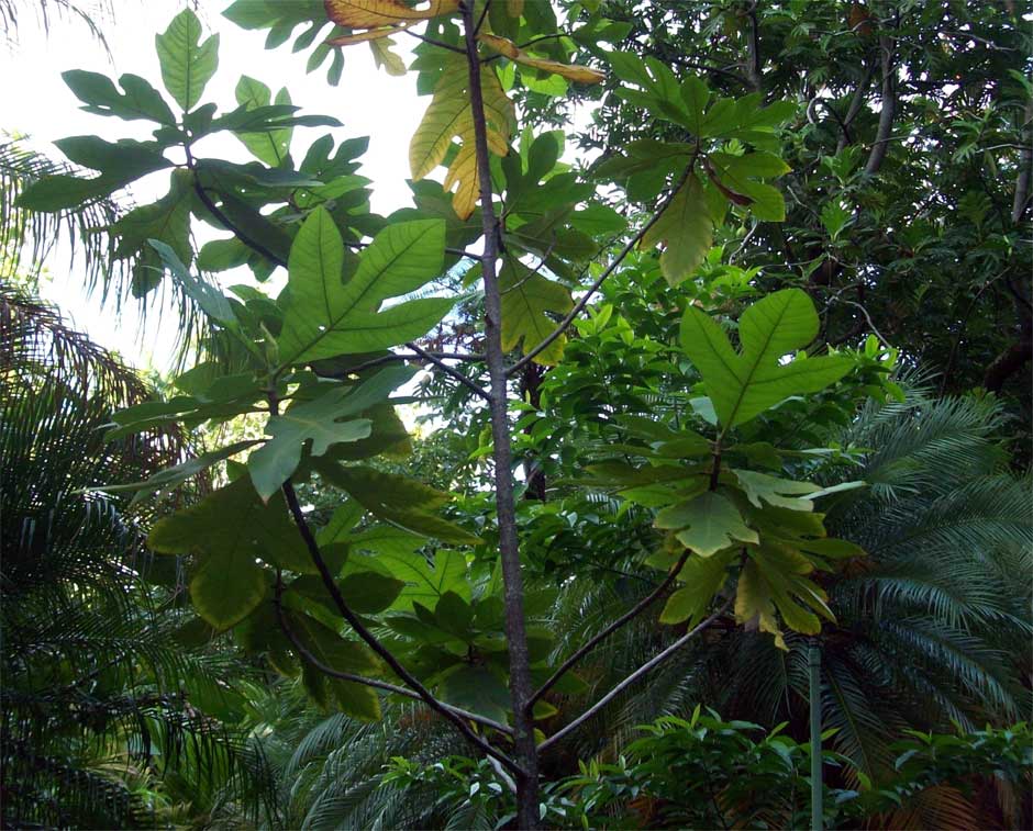 برگ ها به طول 16 تا 50 سانتیمتر و پهنای 11 تا 28 سانتیمتر دیده می شوند.برگ های این درخت مشابه برگ های درخت میوه نان است، با این تفاوت که لوب ها در برگ های این گیاه کمی کوچکتر می باشند. در برخی از گیاهان این گونه، در سال های اولیه بلوغ ممکن است برگ ها فاقد لوب نیز باشند.