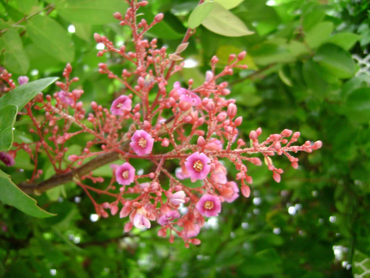 گل ها به رنگ بنفش با خطوطی ارغوانی و کرکدار بوده که در حاشیه ی برگ ها تشکیل می شوند. این گل ها در خوشه های گل کوچک و در انتهای شاخه ها و یا گاهی روی شاخه های بزرگ یا تنه ی اصلی به وجود می آیند. هر خوشه ی گل به وسیله ی یک ساقه ی قرمز رنگ به درخت متصل می شود. گل ها کامل، زنگوله ای شکل، به عرض 6 میلیمتر و دارای پنج گلبرگ هستند.