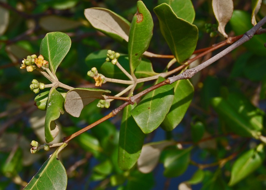 برگها دارای آرایش متقابل، چرم مانند و به رنگ سبز زیتونی هستند. میوه ها سبز، بیضی شکل و از نوع کپسول هستند. میوه ها گاهی بر روی درخت شکاف خورده و بذرها را آزاد می کنند.