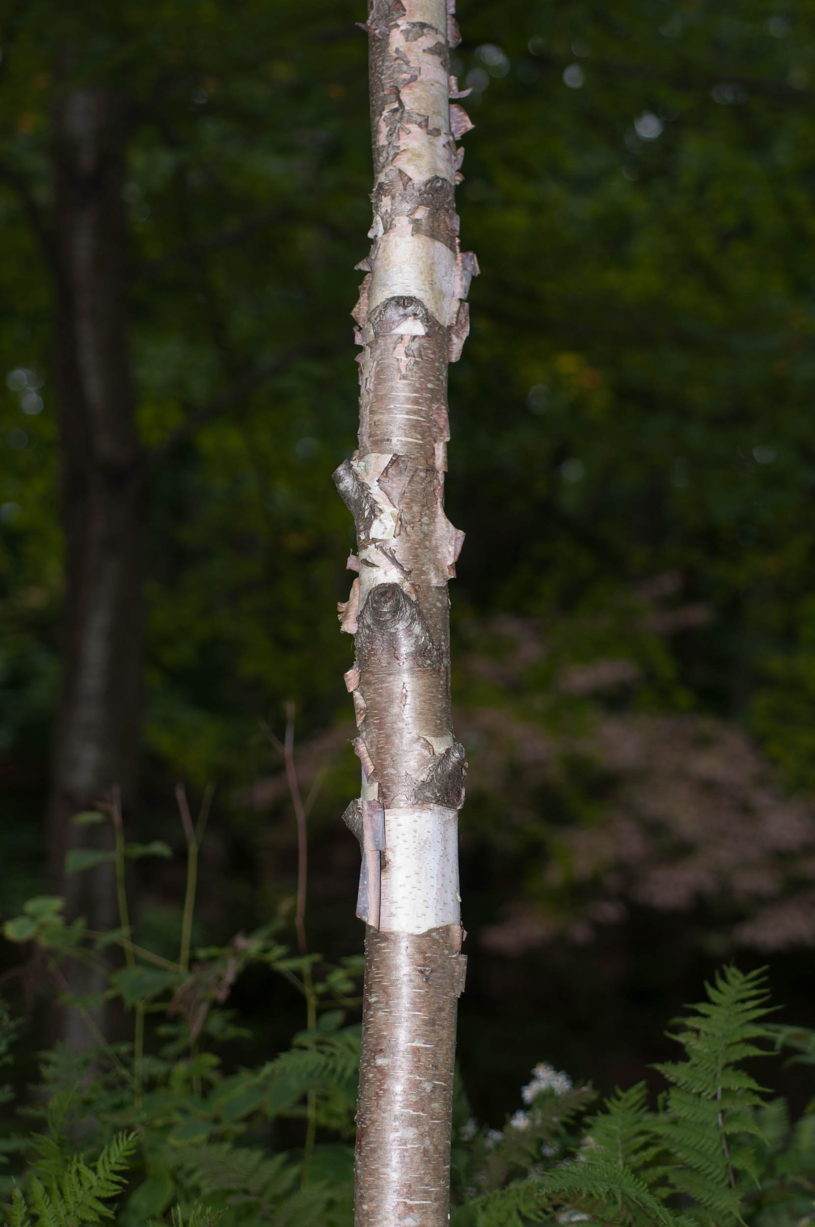 ساقه مستقیم و نسبتاً باریک است و درختان جوان پوستی قهوهای تا خاکستری تیره دارند. ویژگی بارز این گونه، پوست سفید براق تا شیریرنگ درختان بالغ است که به صورت لایههای نازک، کاغذمانند و نوارهایی حلقهشده از تنه جدا میشود. در سطح پوست، عدسکهای تیرهرنگ به صورت لکهها یا نوارهای افقی دیده میشوند که تبادل گازی را تسهیل میکنند.