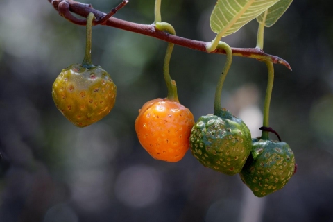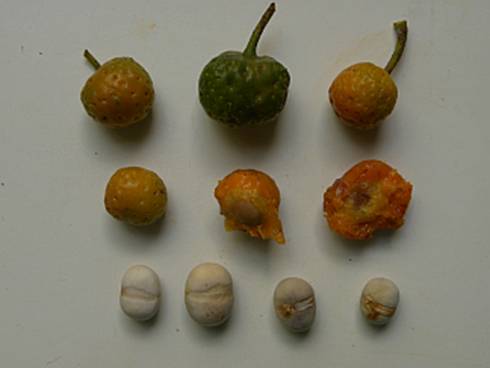 این درختان، میوه های کوچکی تولید می کنند که در صورت رسیده شدن به رنگ نارنجی و با کرک هایی خاکستری مشاهده می شوند. این میوه ها آبدار، شیرین و چسبناک بوده به طوری که همانند صمغ می توانند جویده شوند. میوه ها حدود چهار سانتیمتر نیز قطر دارند.