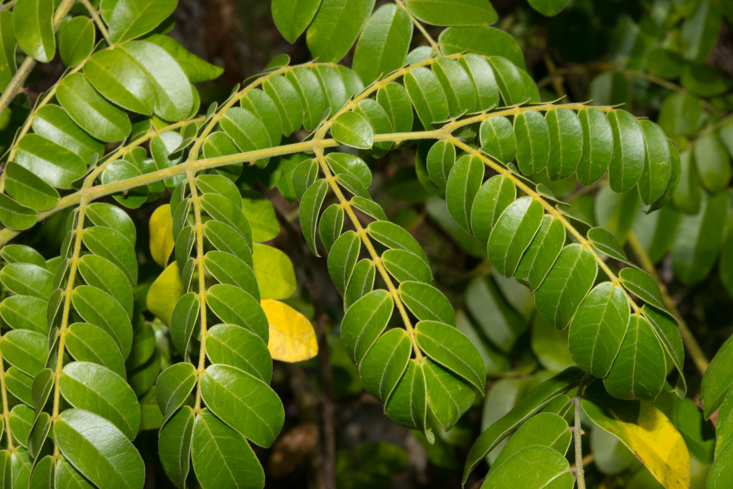 برگها شانهای دوبار شانهای (بیپینه) و بسیار بزرگ، به طول حدود ۱۵ تا ۳۰ سانتیمتر هستند. هر برگ از ۶ تا ۱۲ جفت محور فرعی و هر محور فرعی از چندین جفت برگچه تشکیل شده است. برگچهها بیضوی تا مستطیلی، نوکتیز، به طول حدود ۱ تا ۲ سانتیمتر و به رنگ سبز تیره در سطح فوقانی و سبز کمرنگ در سطح زیریناند.