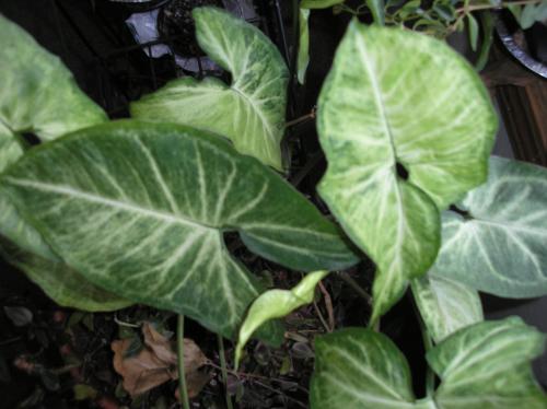 در برخی نمونه ها تنها رگبرگ ها رنگی شده وبقیه برگ ها ممکن است سفید باشند.به هر حال جلوه هایی از رنگ های متنوع را می توان در واریته های مختلف مشاهده نمود.چون برگ ها شباهتی به گوش فیل دارند از این جهت نام گوش فیل به آن داه شده است.