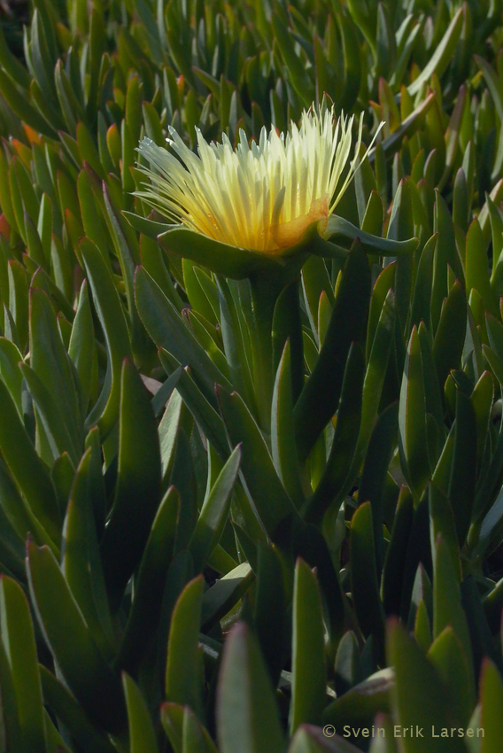 ساقه های افقی آبدار که در نقطه رشد به سمت بالا منحنی شده اند. برگ ها آبدار هستند و در امتداد ساقه قرار دارند. به رنگ زرد تا سبز چمنی و هنگامی که مسن هستند به رنگ قرمز . گل به صورت منفرد و 100-150 میلی متر قطر دارند و به رنگ زرد تا صورتی کم رنگ و در اواخر زمستان و بهار گل ها در می آیند.