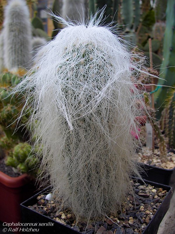 قابل توجه ترین ویژگی آن موهای بلند و پرپشت سفید آن است که برای محافظت از آفتاب در خدمت گیاه است. پوشش موی این گیاه باعث میشود تقریبا مثل برف سفید به نظر برسد و همین امر موجب محبوبیت بیشتر آن شده و به کاکتوس پیرمرد مشهور شده است. در مرحله جوانی موهای ای کاکتوس ، به رنگ سفید مایل به نقره ای است.