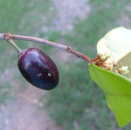 میوه های رسیده به رنگ ارغوانی تیره بوده و دارای پوستی صمغ مانند است که گوشتی سفید رنگ را احاطه کرده است. این میوه ها از نظر اندازه، شباهت زیادی به میوه های زیتون دارند. میوه ها خوردنی بوده ولی نیاز به جویدن زیاد دارند. هر میوه دارای چندین بذر سیاه رنگ است.