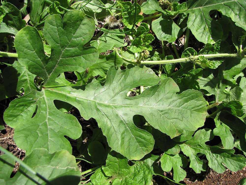 برگ های هندوانه قلبی شکل با بریدگی های عمیق و به رنگ سبز خاکستری با دمبرگ طویل و بدون گوشوارک است. پهنک برگ 3 تا 5 لوپ که هر یک به لوپ های کوچکتری ختم می شوند. برگ ها در ابتدای رشد خود به شدت پوشیده از کرک های نازک هستند. از بغل برگ ها پیچک های مرکب (2 تا 4 شاخه ای) خارج می شوند.