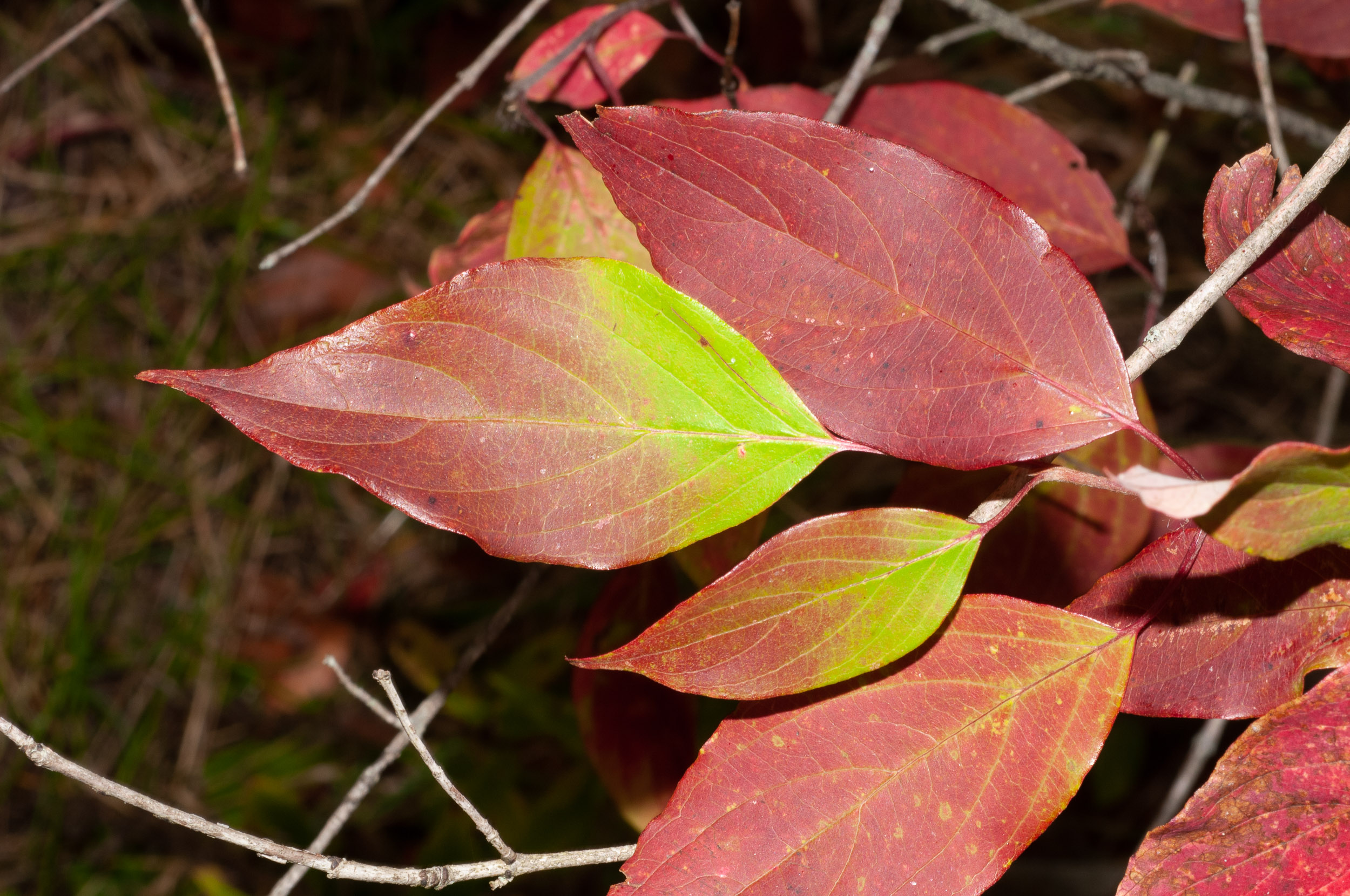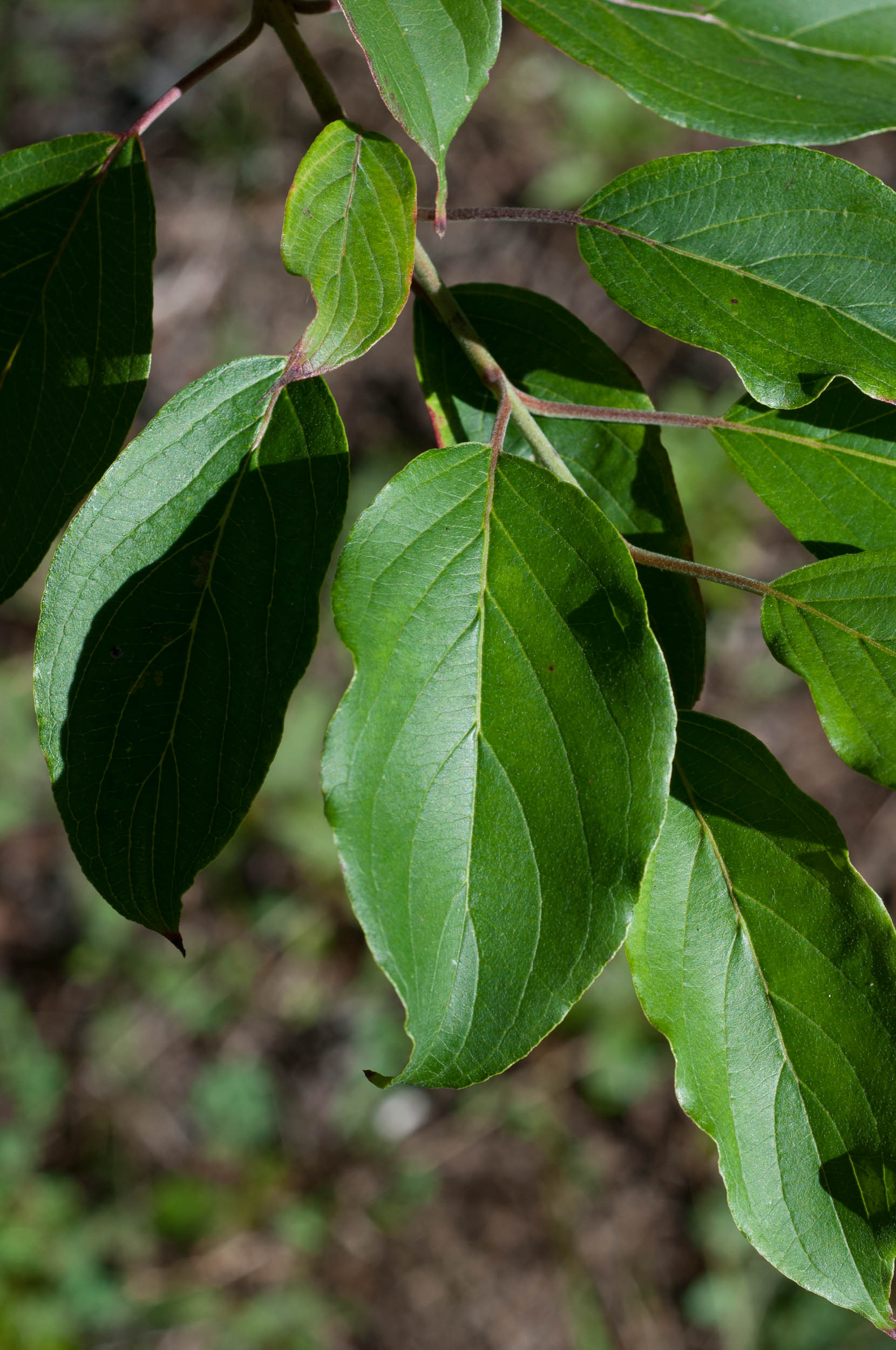برگ‌ها ساده، متقابل و تخم‌مرغی تا بیضوی‌شکل هستند و معمولاً ۵ تا ۱۰ سانتی‌متر طول دارند. لبه برگ‌ها کامل تا کمی موج‌دار بوده و رگبرگ‌های قوسی‌شکل مشخص، از ویژگی‌های بارز جنس Cornus است. سطح رویی برگ سبز تیره و نسبتاً براق و سطح زیرین سبز روشن‌تر و کمی مات است. نوک برگ‌ها اغلب تیز یا کمی کشیده و قاعده آن گرد تا اندکی گوه‌ای است. در پاییز، برگ‌ها می‌توانند به طیفی از زرد کمرنگ تا قرمز مایل به ارغوانی تغییر رنگ دهند.