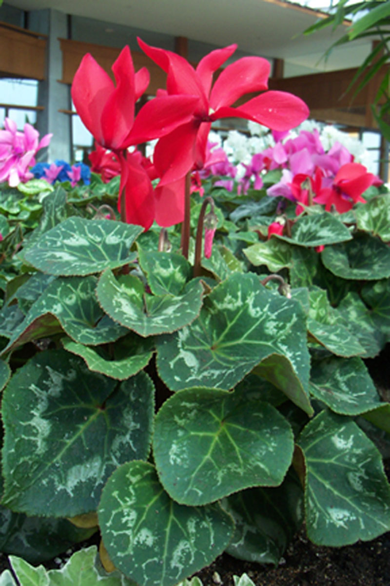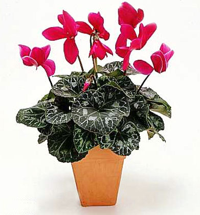 سیکلامن برگهای کروی، قلمی شک و سبز تیره دارد. در بعضی واریته ها لکه های سفید رنگ روی برگها به چشم می خورد. گلهای معطری به طول ۵/۲ تا ۳ سانتی متر و به رنگ صورتی، قرمز، ارغوانی و سفید دارد.