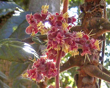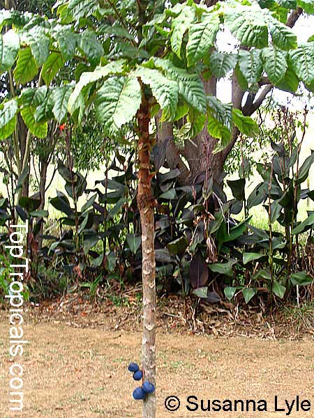 میوه آن قابل خوردن و به رنگ قرمز تیره بوده که بسته به گونه، بصورت گل آذین های خوشه ای و بزرگ روی شاخه ها یا تنه اصلی تولید می شوند. این میوه ها در فصل بهار ظاهر می شوند و هر میوه بیش از 50 میلیمتر قطر می تواند داشته باشد.