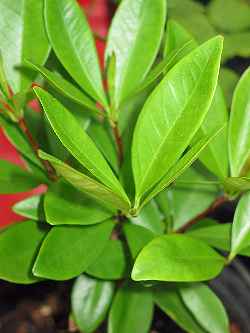 برگ‌ها همیشه‌سبز، متقابل و چرمی هستند. شکل آن‌ها بیضوی تا بیضوی-کشیده با طول حدود ۴ تا ۱۰ سانتی‌متر و عرض ۲ تا ۴ سانتی‌متر است. سطح فوقانی برگ‌ها سبز تیره و براق و سطح زیرین سبز روشن‌تر است. رگبرگ میانی برجسته و حاشیه‌ها کامل و بدون دندانه‌اند که ظاهری صاف و منظم ایجاد می‌کند.