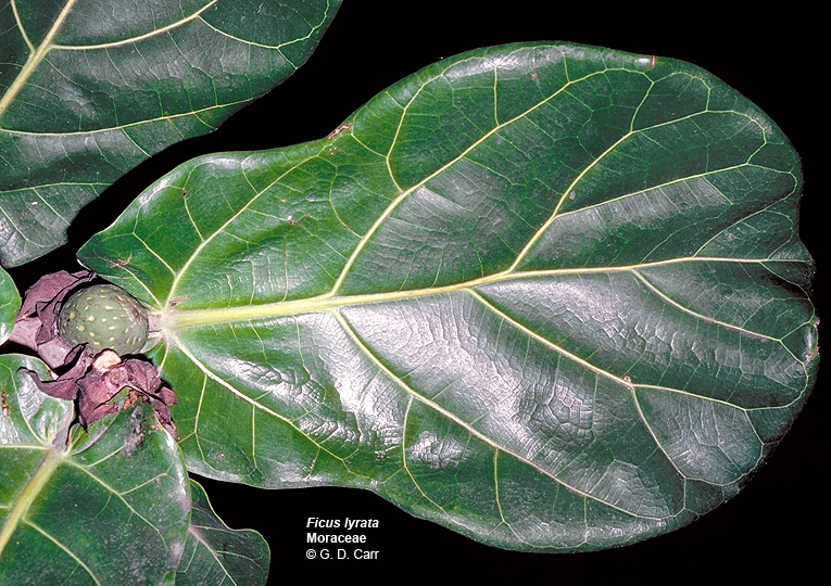 برگها : این گیاه بعلت برگهایش گاهی انجیری ویولونی مینامند . رنگ برگها سبز تیره با رگبرگ روشن هستند . اندازه برگها ۳۰تا ۵۰ سانتیمتر بوده و جنبه تزئینی آن زیاد است .اندازه برگها و طرز قرار گرفتن آنها بر روی ساقه باین گیاه علیرغم جثه نسبتا” بزرگش شکل دلپذیری میدهد .