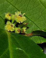 برگ های بالغ دوکی شکل تا بیضی شکل هستند. سطح بالای برگ ها براق بوده و دارای حاشیه ای دندانه دار می باشند. این برگ ها حدود 8 تا 20 سانتیمتر طول و حدود 3 تا 15 سانتیمتر نیز پهنا دارند. برگ های جوان به رنگ های نارنجی روشن تا قرمز دیده می شوند و در اثر بلوغ به رنگ سبز تغییر می یابند.