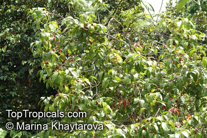 میوه ها شباهت زیادی به گیلاس داشته و در خوشه هایی تولید می شوند. این میوه ها گرد و براق بوده و رنگ آن از سبز کمرنگ (در میوه های نارس) تا قرمز پررنگ (در میوه های رسیده و بالغ) متغیر است. هر میوه ها حدود یک تا سه سانتیمتر قطر دارد. گوشت میوه ترد ولی دارای مزه ای اسیدی و ترش است. این میوه ها خوراکی بوده ولی معمولاً به صورت تازه خوری مصرف نمی گردند و اغلب در مرباها، کنسروها و شربت ها مورد استفاده قرار می گیرند.