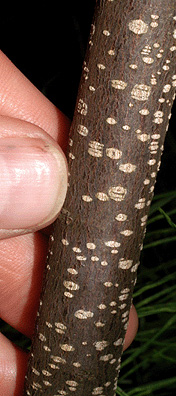 پوست ساقه سیاه توسه خاکستری رنگ و سطح آن پوشیده از تعداد زیادی برجستگی های منفذمانند (عدسک ها) می باشد.