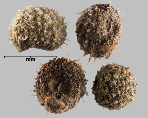 ميوهٔ اين گياه گرد، به قطر ۴ تا ۶ سانتیمتر و شامل کرک هاى چسبنده است. بذرها کروی، پوشيده از کرک هاى زبر و خارمانند هستند و در قاعده غده اى شکل و در رأس قلاّب مانند هستند. هر گياه قادر است حدود ۳۰۰ تا ۴۰۰ بذر توليد کند که اين بذرها معمولاً در طول سال و در عمق ۱ تا ۵ سانتیمترى خاک جوانه مى زنند.