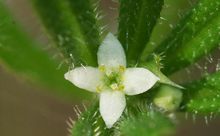 گل ها کوچک، به پهناى ۲ ميلیمتر و سفيدرنگ هستند و بر روى پايهٔ کوتاهى در بغل برگ ها قرار دارند و شامل ۴ گلبرگ هستند.