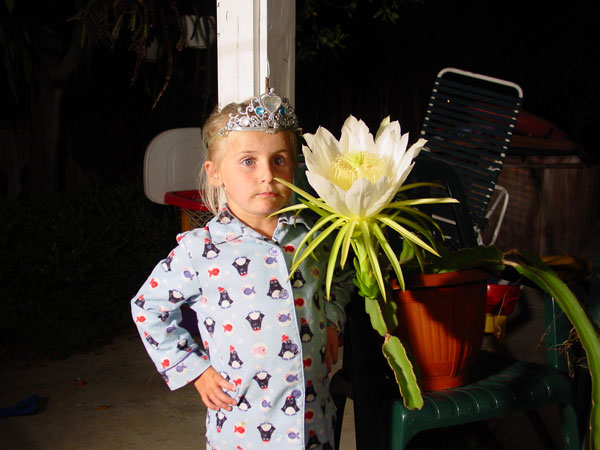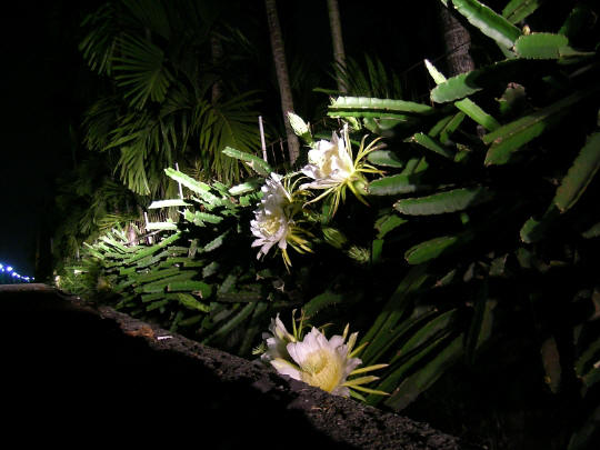 گل های این گیاه معطر و به طول 25 تا 30 سانتیمتر و پهنای 15 تا 17 سانتیمتر بوده که در شب شکوفا می شوند. این گل ها دارای پیش برچه هایی به طول 2.5 تا 5 سانتیمتر و ضخامت 2.5 سانتیمتر و برگک هایی (براکتئول هایی) تخم مرغی شکل هستند. نهنج حدود 3 سانتیمتر ضخامت دارد. گلبرگ های بیرونی نیزه ای شکل و خطی و نوک تیز با 10 تا 15 سانتیمتر طول و 10 تا 15 سانتیمتر عرض بوده و به رنگ زرد مایل به سبز یا سفید و یا به ندرت قرمز کم رنگ می باشند. گلبرگ های درونی نیزه ای یا واژنیزه ای شکل، با بیش از 10 تا 15 سانتیمتر طول و حدود 40 سانتیمتر پهنا، نوک تیز، غیر شکننده و سفید رنگ هستند. پرچم ها نیز حدود 5 تا 10 سانتیمتر طول دارند. محفظه های حاوی شهد نیز حدود 30 میلیمتر طول دارند.