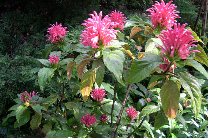 Jacobinia carnea Brazilian plume flower که به فارسی جکوبینیا نامیده میشود، گیاهی از خانواده آکانتاسه، بومی شرق برزیل می باشد. نیاز های این گیاه عبارتند از نور: متوسط رطوبت: کمی مرطوب دمای محیط: آب و هوای گرم و نیمه گرم خاک: انواع مختلفی از خاک ها
