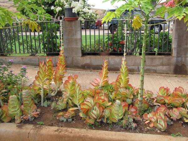 این گیاهان گوشتی بوده و ساقه هایی به طول حدود یک متر تولید می کنند که پس از گلدهی از بین رفته و می پوسند. شکل پایه ی برگ های این گیاهان به حالت یک رزت بزرگ، پهن، گرد، گوشتی، بدون دمبرگ، به رنگ سبز مایل به خاکستری با حاشیه ای قرمز رنگ که به وسیله ی پودری سفید رنگ پوشیده شده اند، می باشد.