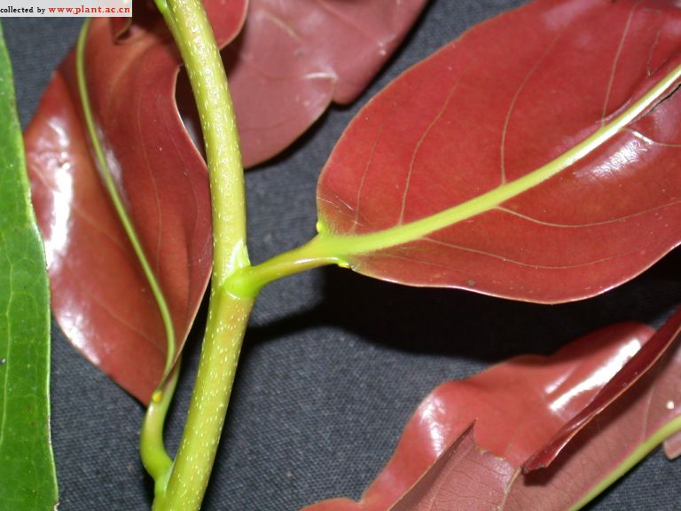 برگ ها، خزاندار، متناوب، گاهی به صورت مارپیچی، بیضوی شکل تا نیزه ای و باریک و در هر دو انتها به صورت نوک تیز می باشند. این برگ ها حدود 10 تا 30 سانتیمتر طول و 3 تا 9 سانتیمتر پهنا داشته و دارای رگبرگ میانی ضخیم است که هم در سطح بالایی و هم در سطح پایینی بسیار برجسته و نمایان می باشد. شاخ و برگ این درخت به رنگ برنزی و یا ارغوانی مایل به قرمز و بسیار پرجلوه هستند.
