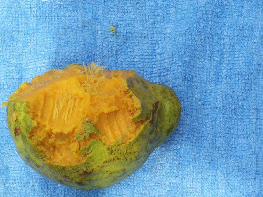 گیاه باهیا سانساپوت دارای میوه هایی در اندازه های متوسط و پوستی سبز و دارای برآمدگی هایی است. این میوه ها دارای شکلی تخم مرغی شکل و زبر و پالپی به رنگ زرد مایل به نارنجی می باشند. پالپ این میوه ها دارای عطری قوی و طعمی ملایم و شیرین و خوب است.