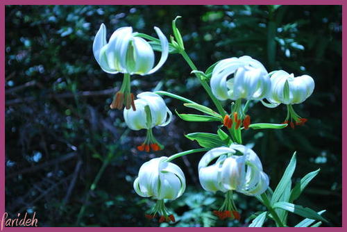 گلها به صورت سفید و واژگون بوده ، گلبرگ ها برگشته و پرچم هایی بلند (شبیه به چلچراغ) دارد .