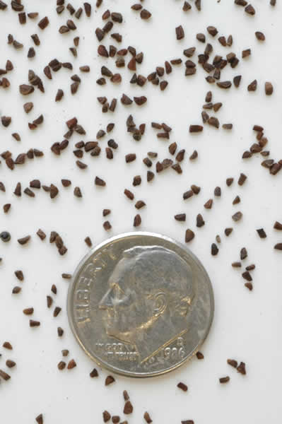 میوه گل مغربی براق و به شکل کپسول به طول سه تا پنج سانتیمتر و به ضخامت پنج تا هفت میلیمتر بوده و کم و بیش پهن است. میوه های رسیده به رنگ قهوه ای مایل به سرخ است. دانه های نیز به رنگ قهوه ای تیره، گوشه دار و نامنظم هستند. سطح دانه برجسته و زبر است. ضخامت دانه رسیده یک تا 1.4 میلیمتر و طول آن به 1.5 تا 2 میلیمتر می رسد. وزن هزاردانه 0.4 تا 0.8 گرم است.