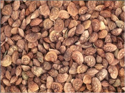 درون هر غلاف یک دانه منفرد قلوهای شکل، با سطح صاف به رنگ قهوای، زیتونی روشن یا تیره به طول ۳ میلی متر که ناف آن در میانه مقعر میباشد.
