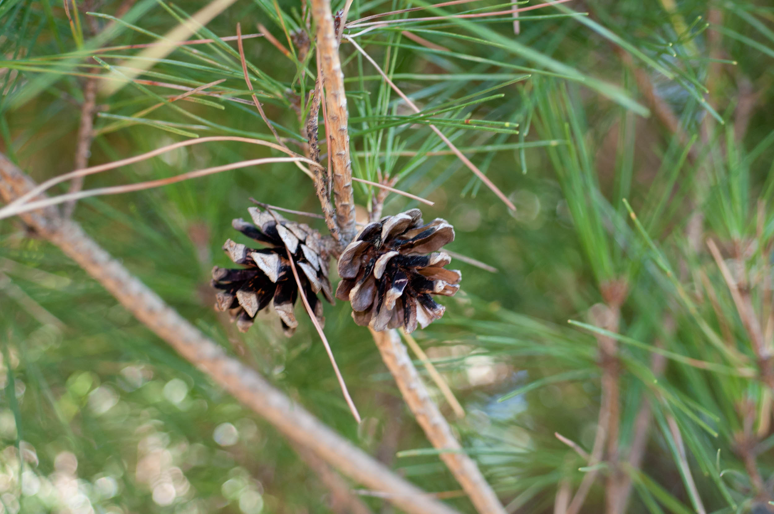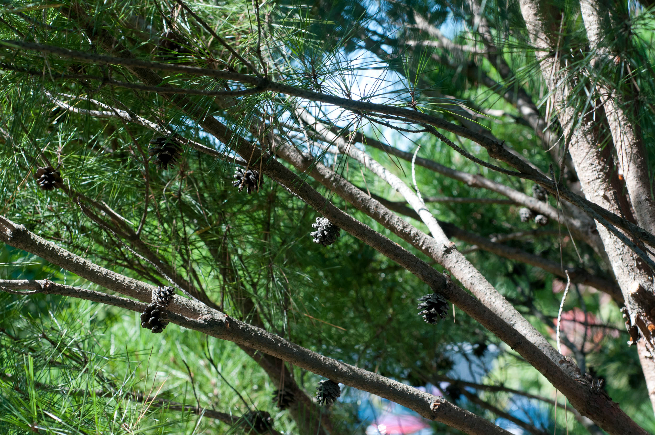 تاج درخت معمولاً گسترده و نسبتاً باز است و در سنین بالاتر شکلی چتری یا نامنظم پیدا میکند. شاخههای افقی یا کمی خمیدهاند و در بخش فوقانی درخت متراکمتر هستند. جوانهها استوانهای، کشیده و با فلسهای قهوهای روشن پوشیده شدهاند که گاهی در حاشیه اندکی شفاف و رزیندارند.