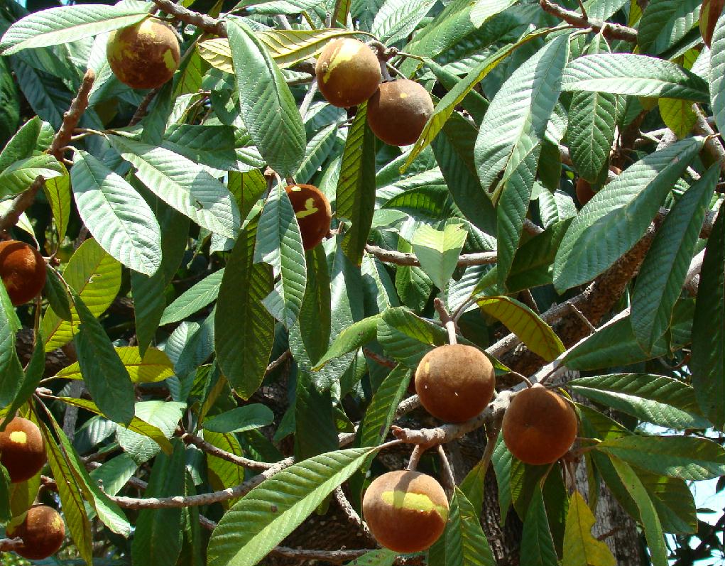 میوه ها از نوع سته ای، 5 تا 8 سانتیمتر، با پوستی قهوه ای رنگ و گوشتی سفید مایل به زرد و مزه ای ملایم هستند. هر میوه حاوی یک تا چهار بذر بزرگ است.