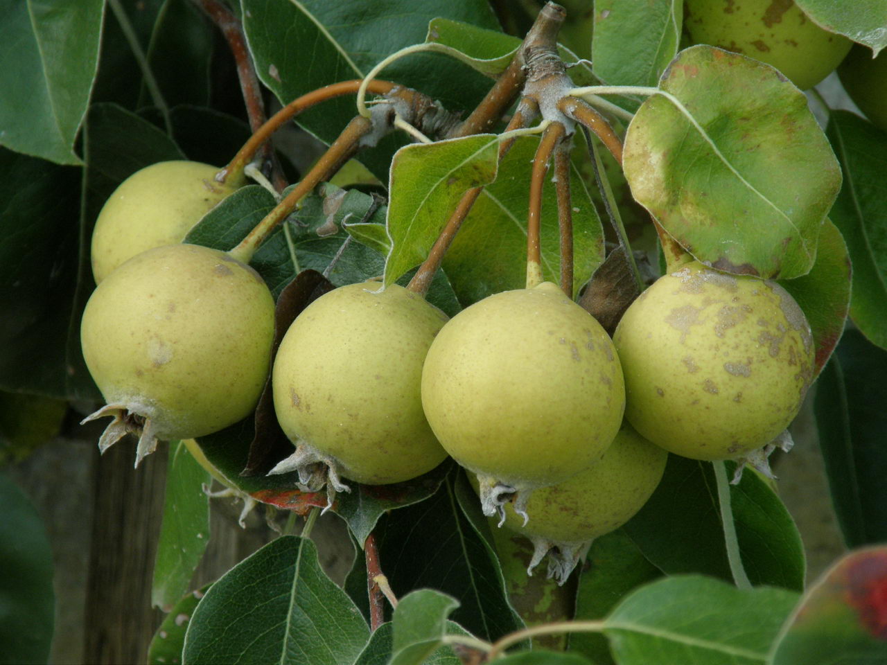 آتشک (Erwinia amylovora) با سیاهشدن سرشاخهها و حالت «سوختگی» شناخته میشود؛ هرس شاخههای آلوده با فاصله از بافت سالم و ضدعفونی ابزار ضروری است. لکه سیاه گلابی (Venturia pyrina) لکههای تیره روی برگ و میوه ایجاد میکند؛ جمعآوری برگهای ریخته و برنامه قارچکش پیشگیرانه در دورههای مرطوب کاربردی است. سفیدک سطحی (Podosphaera) باعث پوشش سفید و بدشکلی رشد میشود و با کاهش تراکم تاج و محلولپاشی گوگرد در شرایط مناسب کنترل میگردد.
