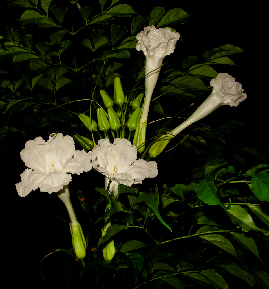 در شرایط آپارتمانی به ندرت گل می‌دهد؛ اما در محیط مناسب، گل‌ها قیفی‌شکل، لوله‌ای و به رنگ سفید مایل به کرم تا زرد کم‌رنگ هستند و در خوشه‌های انتهایی ظاهر می‌شوند. میوه به صورت غلاف باریک و دراز است که در محیط گلدانی معمولاً تشکیل نمی‌شود.